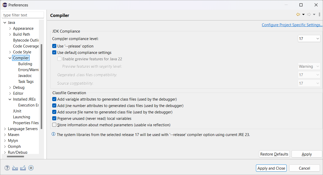 Configure the compiler compliance level for 17 by selecting Preferences > Java > Compiler. Choose 17 from the dropdown: